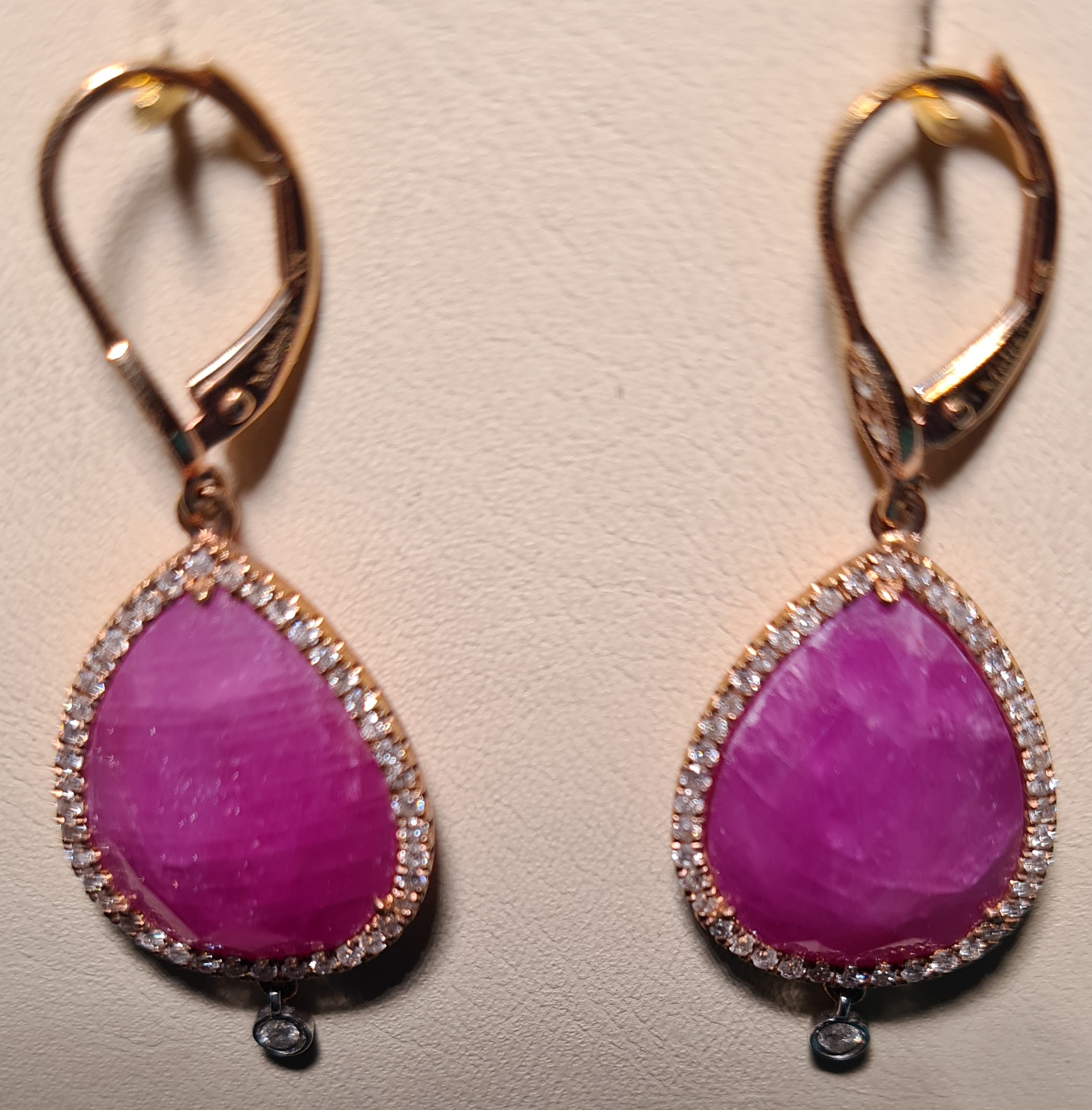 Orecchini oro rosa di gr. 6,67 ognuno formati da rubini sfaccettati forma goccia e diamanti taglio brillante.