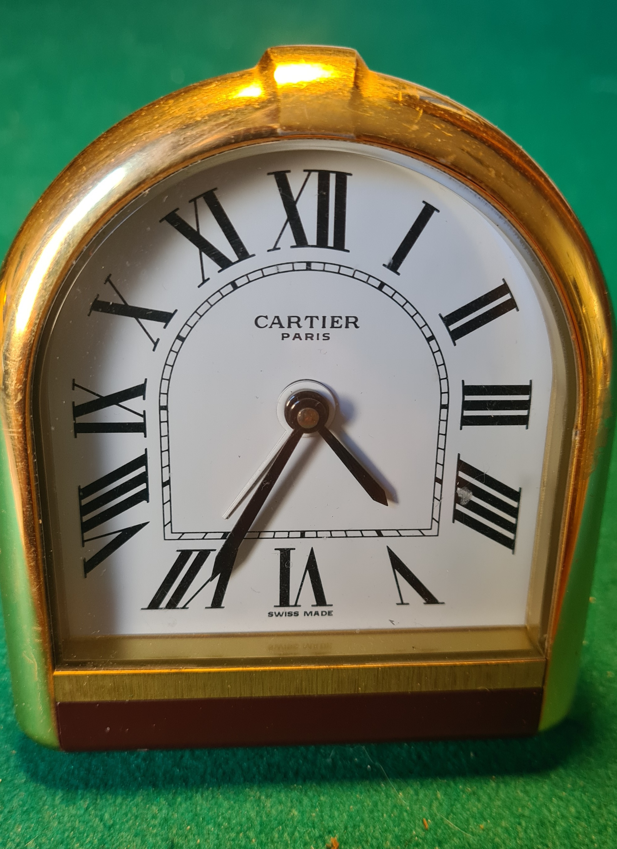 Sveglia pendulette Romane di Cartier realizzata in Svizzera negli anni '80. Placcata in oro 18 carati. Quadrante in smalto bianco. Cassa dell'orologio numerata 06018
