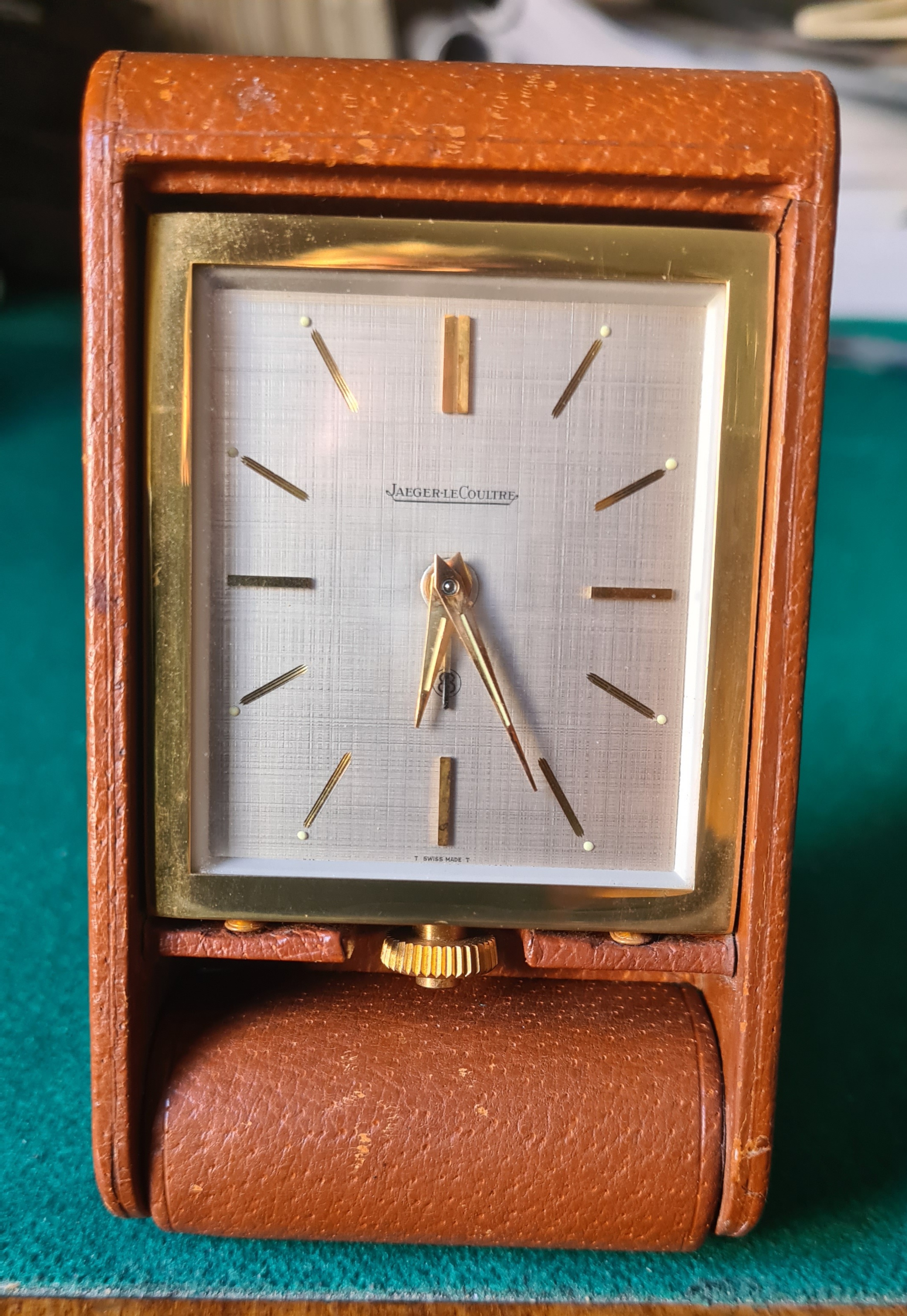 Pendulette Jaeger Lecoultre da viaggio placcato oro con cassa rivestita in pelle. Condizioni buone. Carica manuale, anni 70 vintage.