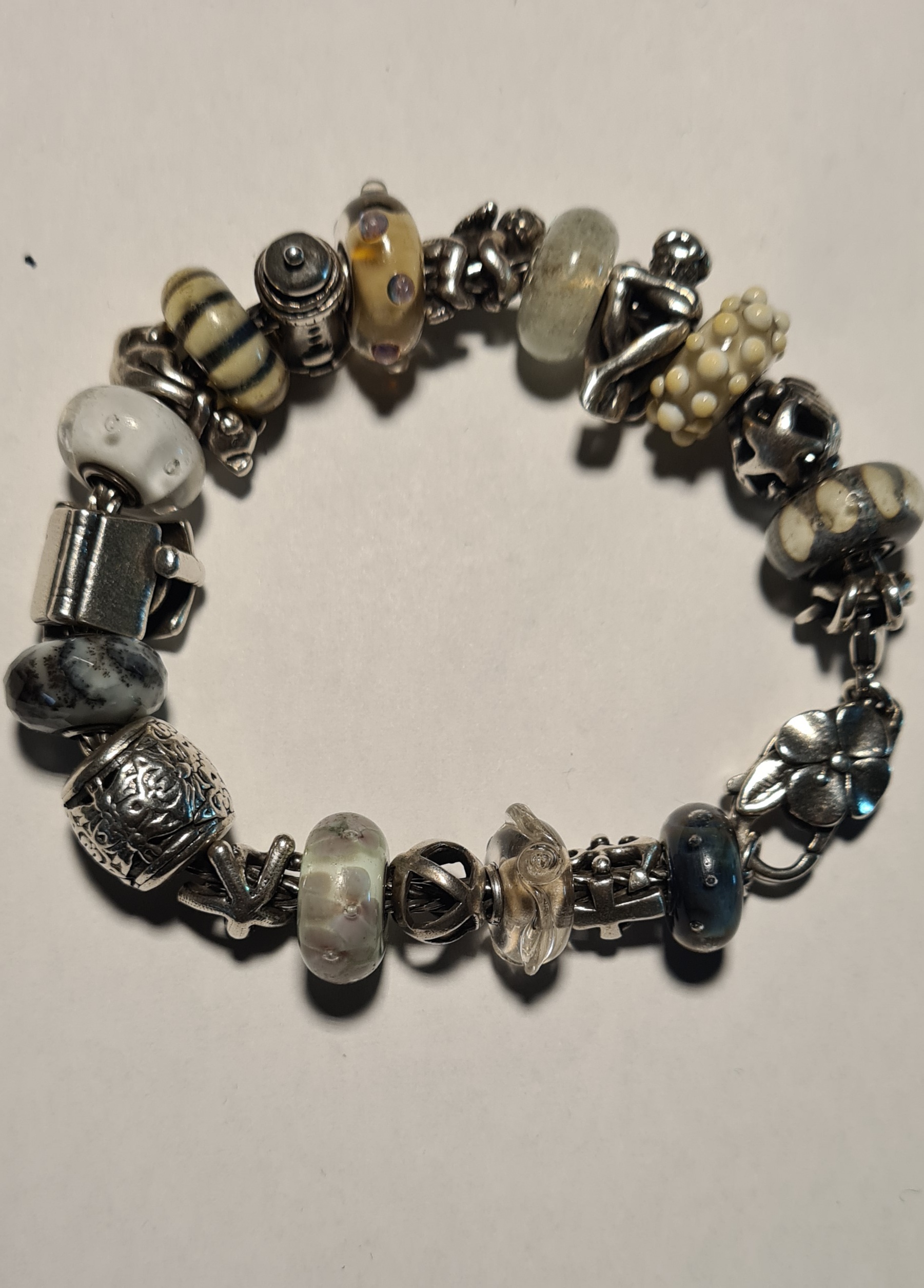 Bracciale Trollbeads in argento formato da 10 beads e 11 elementi d'argento piu' fermatura in argento floreale.