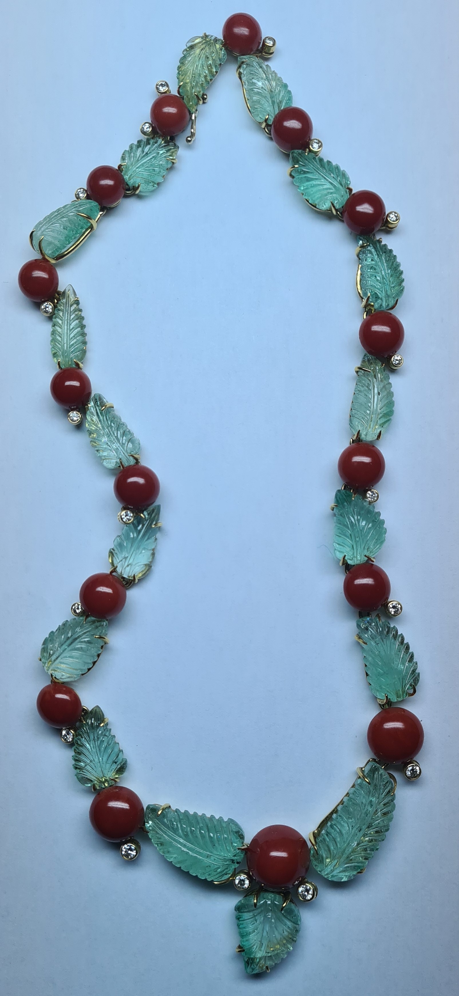 Collana artigianale in smeraldo a forma foglia e corallo rosso, oro giallo 18kt.